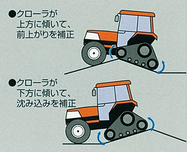 三角形のクローラは、地面の凸凹に合わせて揺動軸を中心にして揺動するため、機体の上下動(ピッチング)を抑え、安定した作業姿勢を保ちます。