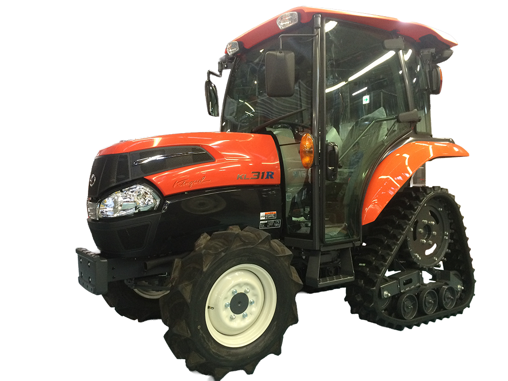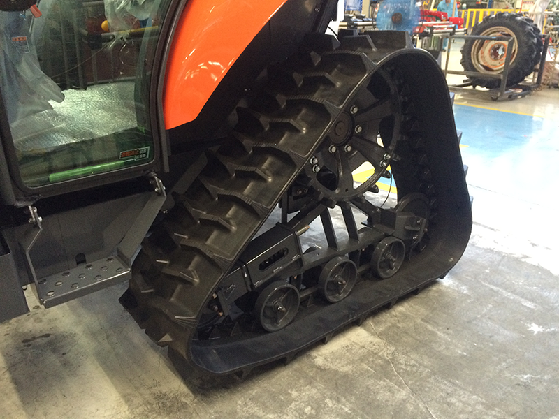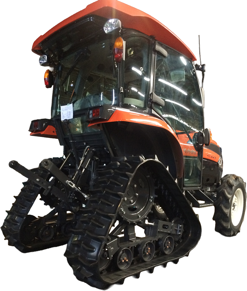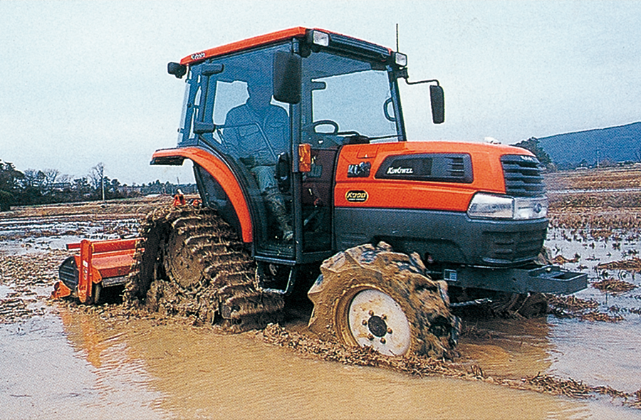 前輪はホイール、後部は三角形クローラ方式を採用したクボタパワークローラトラクタ”パワクロ”。